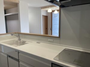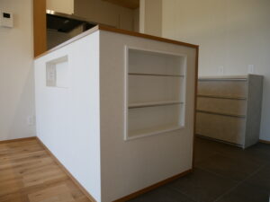 腰壁のニッチは、コンセントが設置してあるので、ホットプレート料理や携帯の充電などなど…
