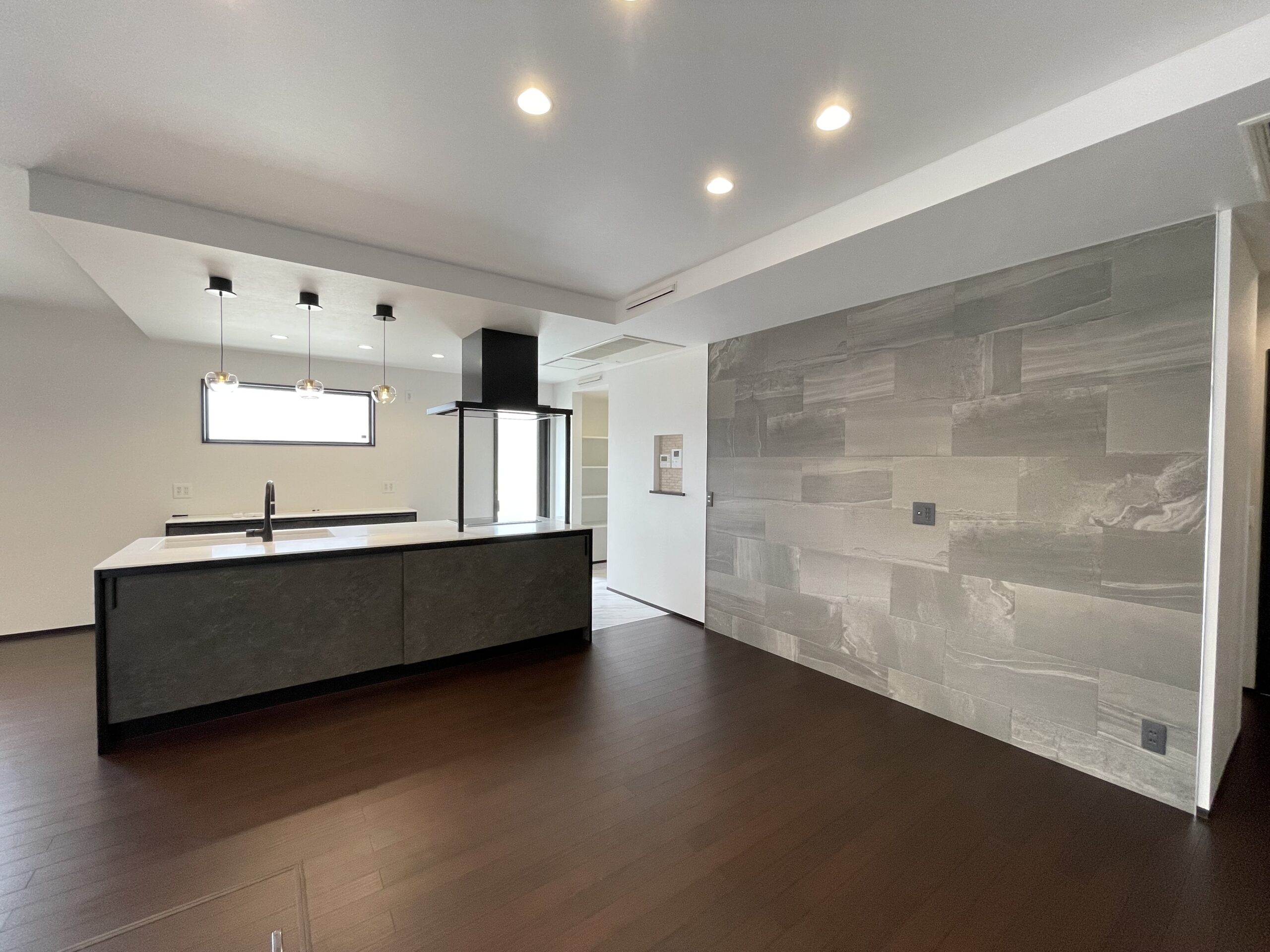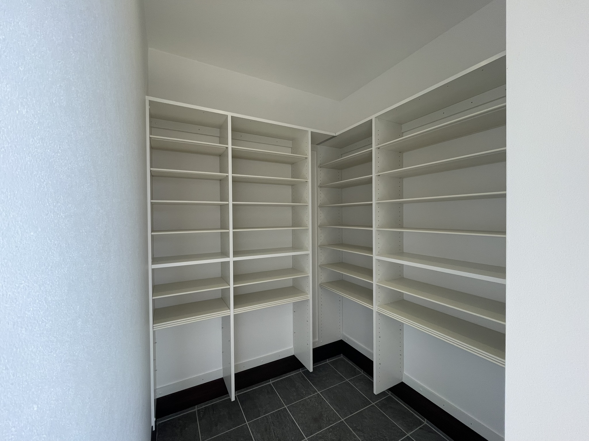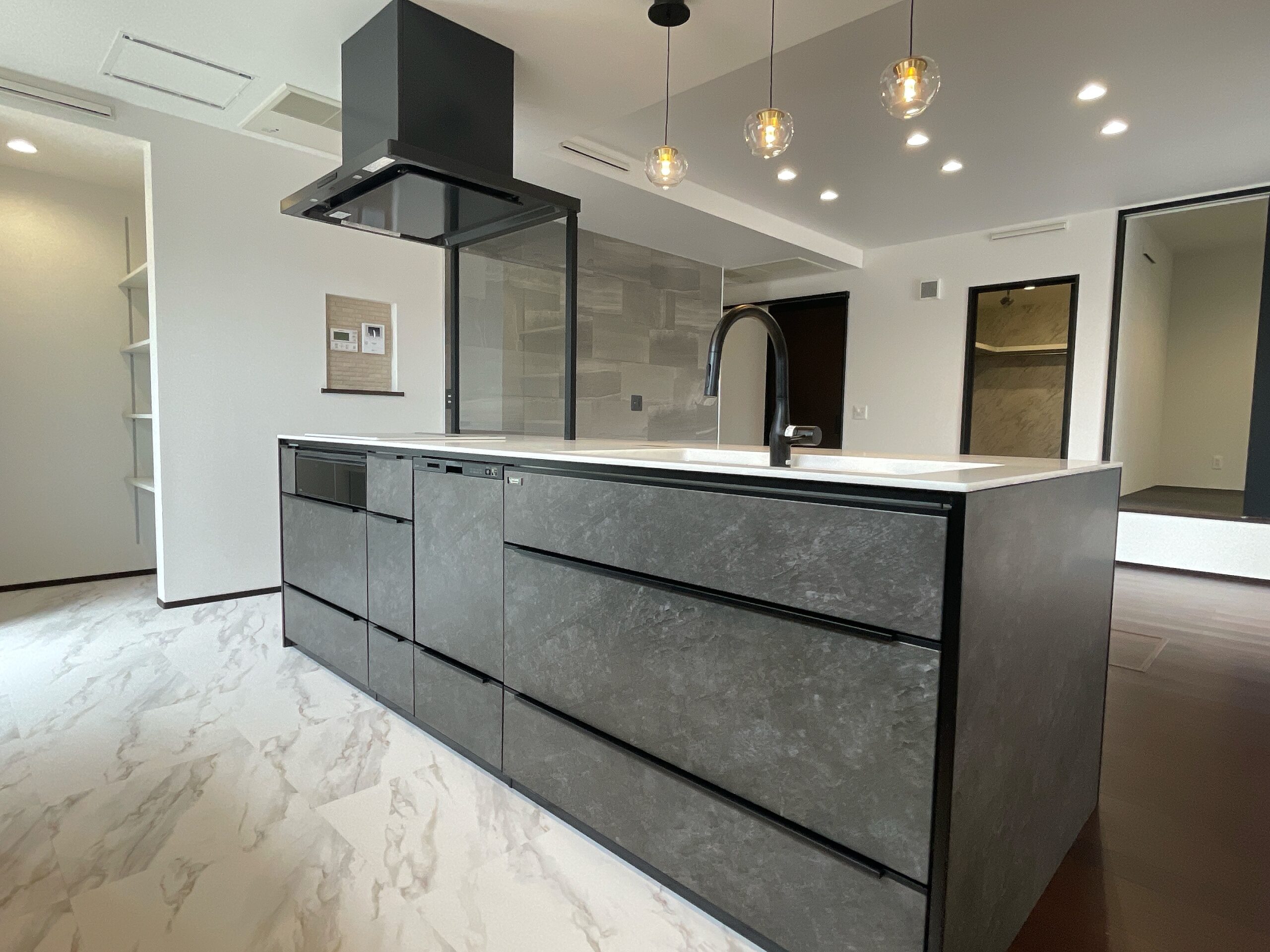 アイランドキッチンの重厚感がでてますね! キッチンからパントリーへはフロアタイルを貼っています♪